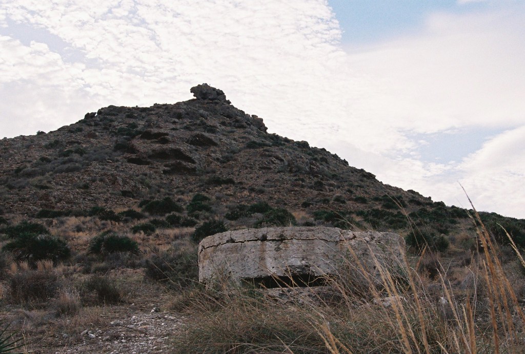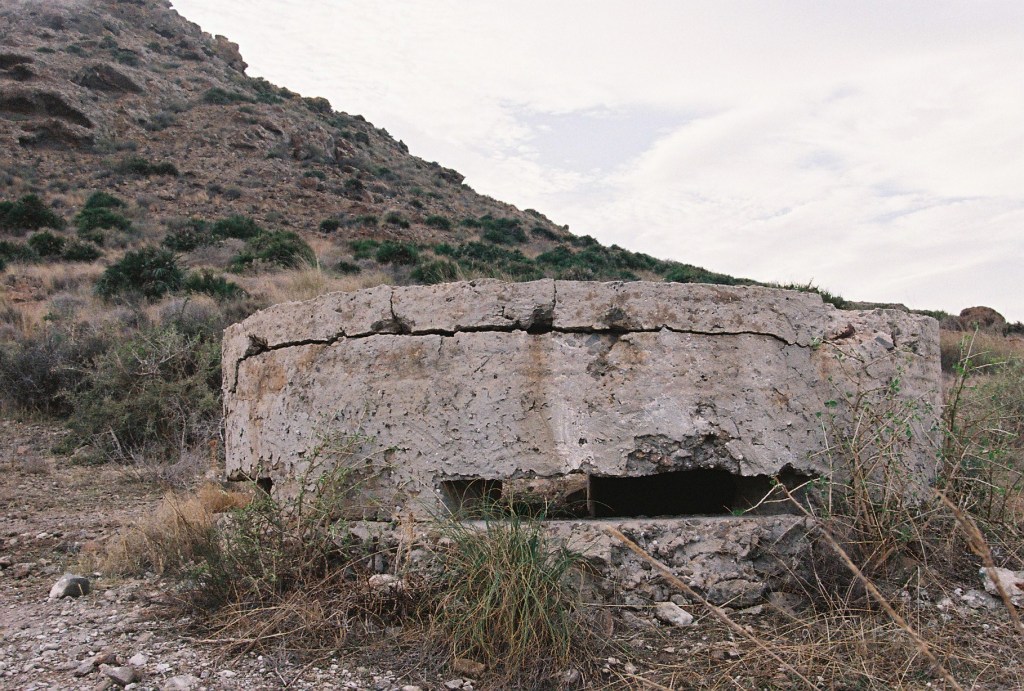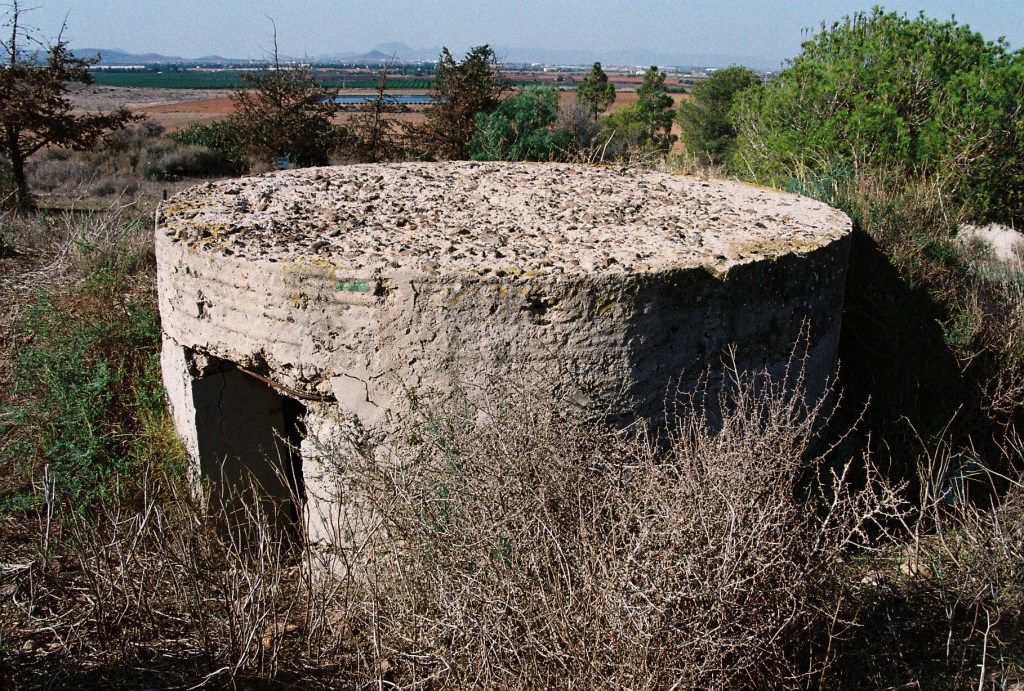 A lo lejos, comenzaron a aparecer los primeros bloques de hormigón. Algunos eran cuadrados, pesados, como piezas caídas de una estructura mayor. Otros, en cambio, tenían forma de cilindro, con pequeñas aberturas desde las que se podía mirar hacia el horizonte. Me acerqué a uno: por dentro era oscuro, fresco, y desde la rendija se dominaba toda la extensión del Campo de Cartagena. La vista era amplia, casi total; el mundo parecía medirse desde ese punto, contenido dentro del marco de cemento.