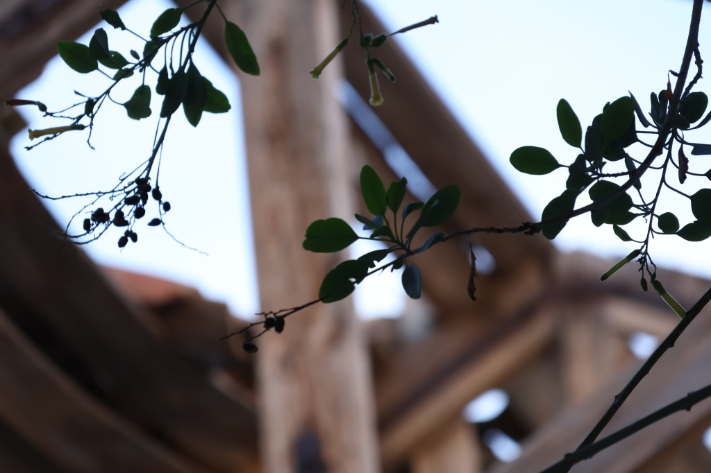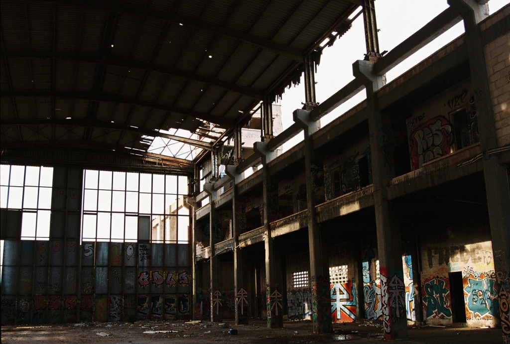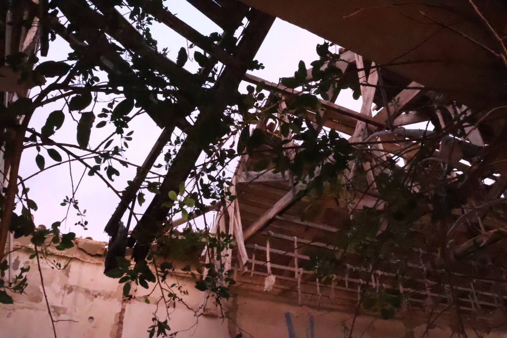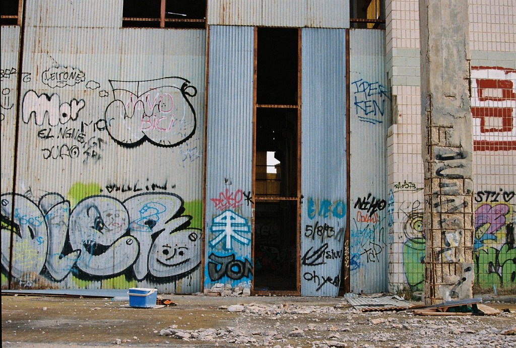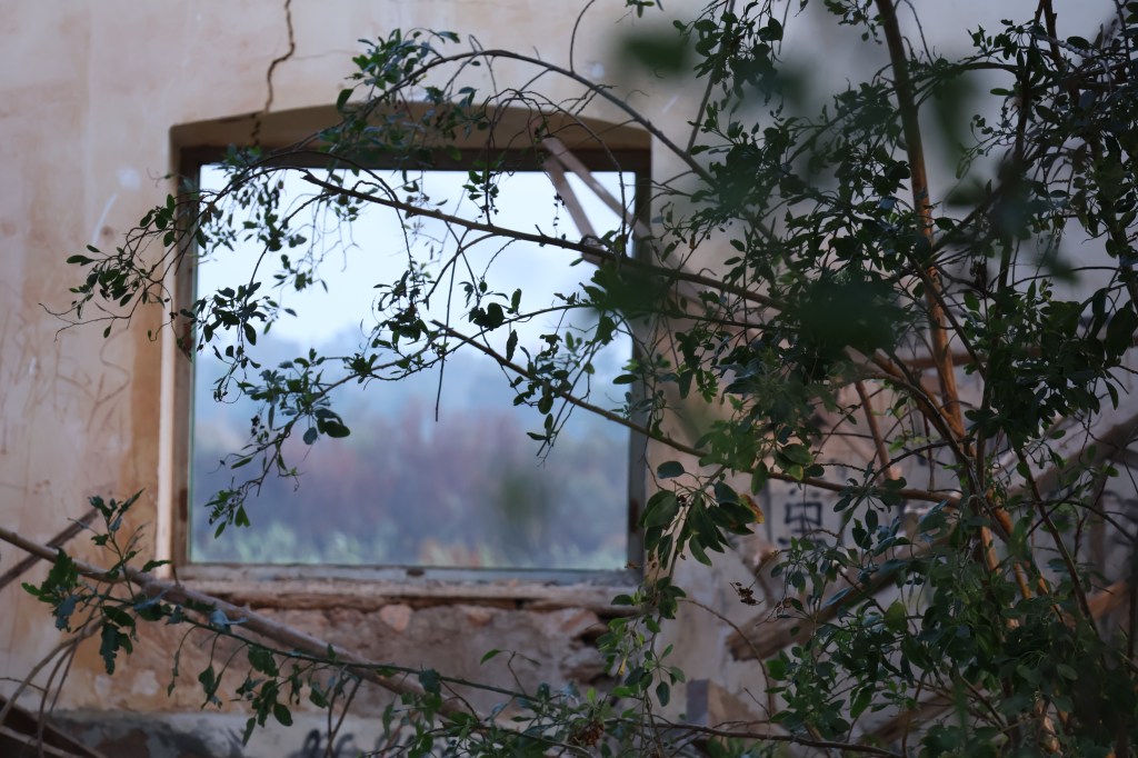 Cuando alcanzo el hormigón, levanto la vista: la entrada trasera de la nave se abre como una herida en la estructura. Entro. Dentro, el aire cambia: más frío, más espeso. El eco multiplica cada paso y los pájaros, que anidan en las vigas, se agitan inquietos, graznan. Me siento una intrusa. Es como si todo el edificio respirara y mi presencia rompiera su ritmo natural.Camino entre trozos de pared rota, tejas de amianto, chapas retorcidas y grafitis que se mezclan con las manchas del tiempo. Algunos son solo firmas, otros figuras en rojo y negro que parecen observarme desde el muro. Me detengo un instante. Lo que más me impresiona no es la ruina, ni el color, ni el abandono, sino el silencio: un silencio espeso que parece tener peso propio. Pienso en cómo, en otro tiempo, aquí habría un murmullo constante: órdenes, motores, voces, el chirrido de las herramientas. Todo eso se ha desvanecido. Lo que queda es brisa y calma, el rumor de las cañas de bambú chocando unas con otras fuera, como un eco remoto del movimiento humano que fue.