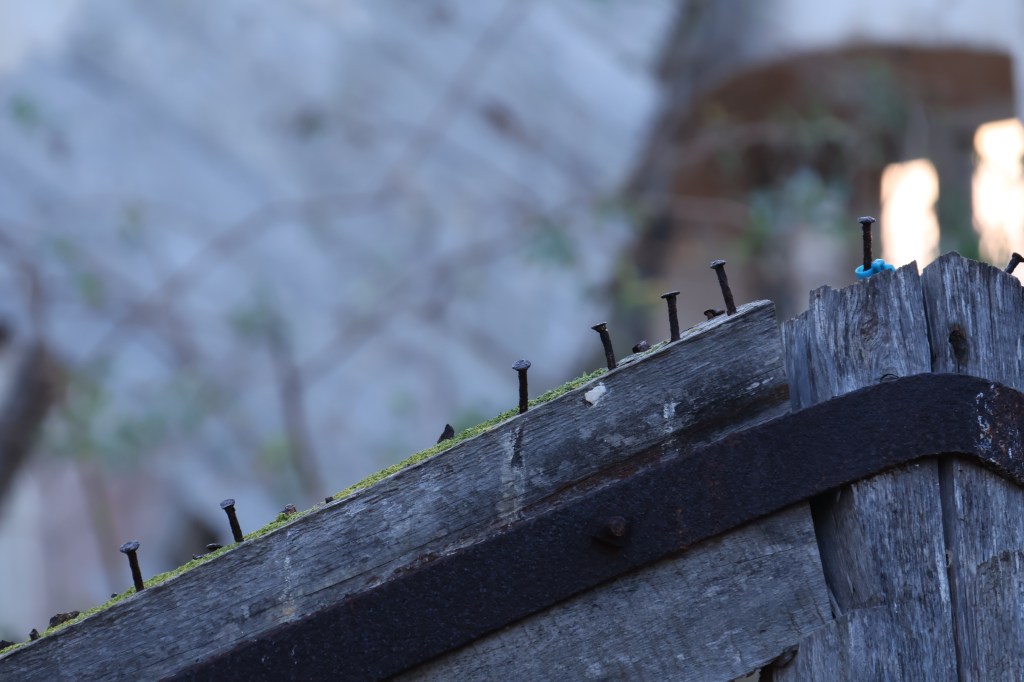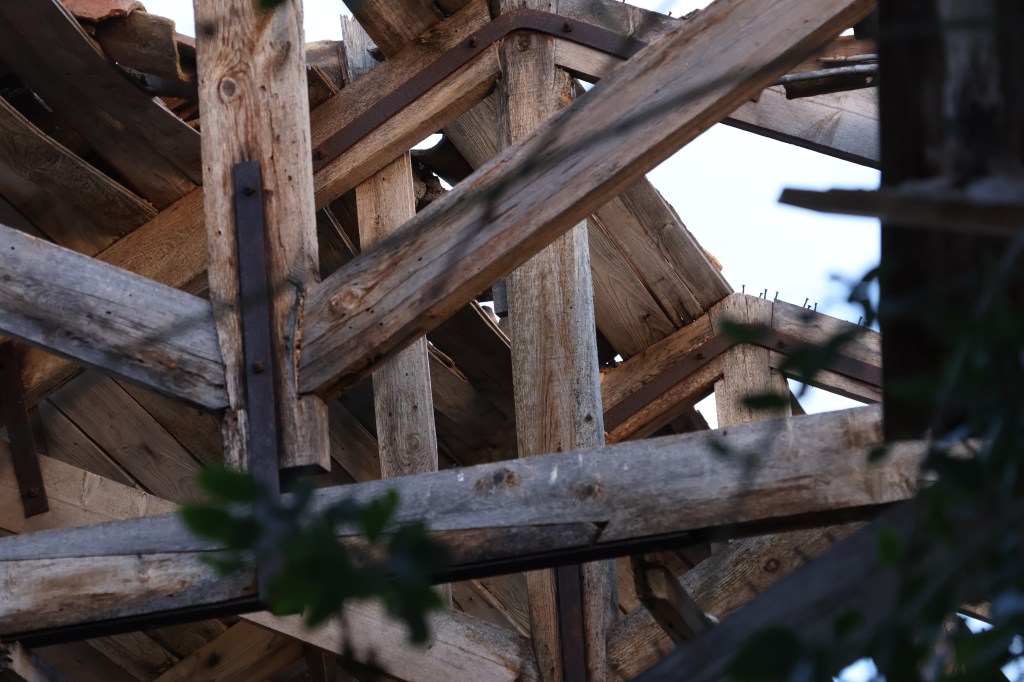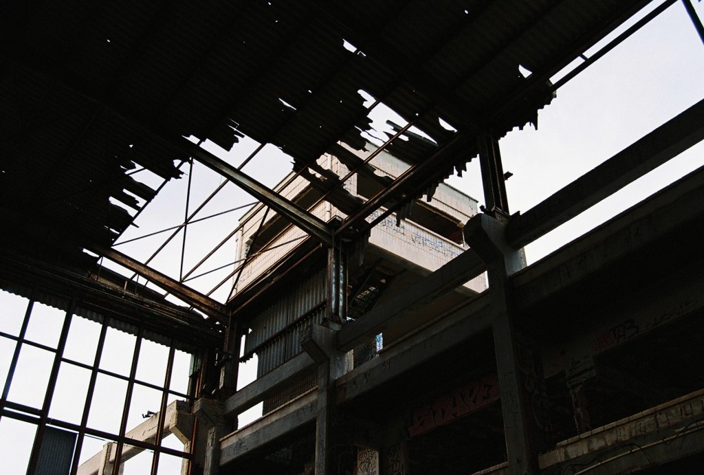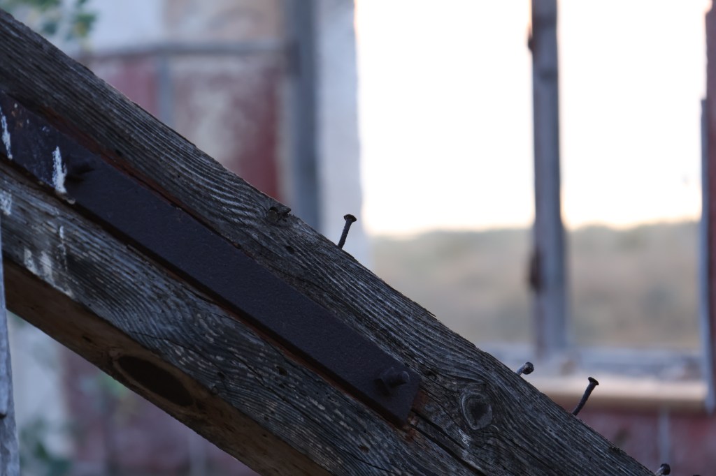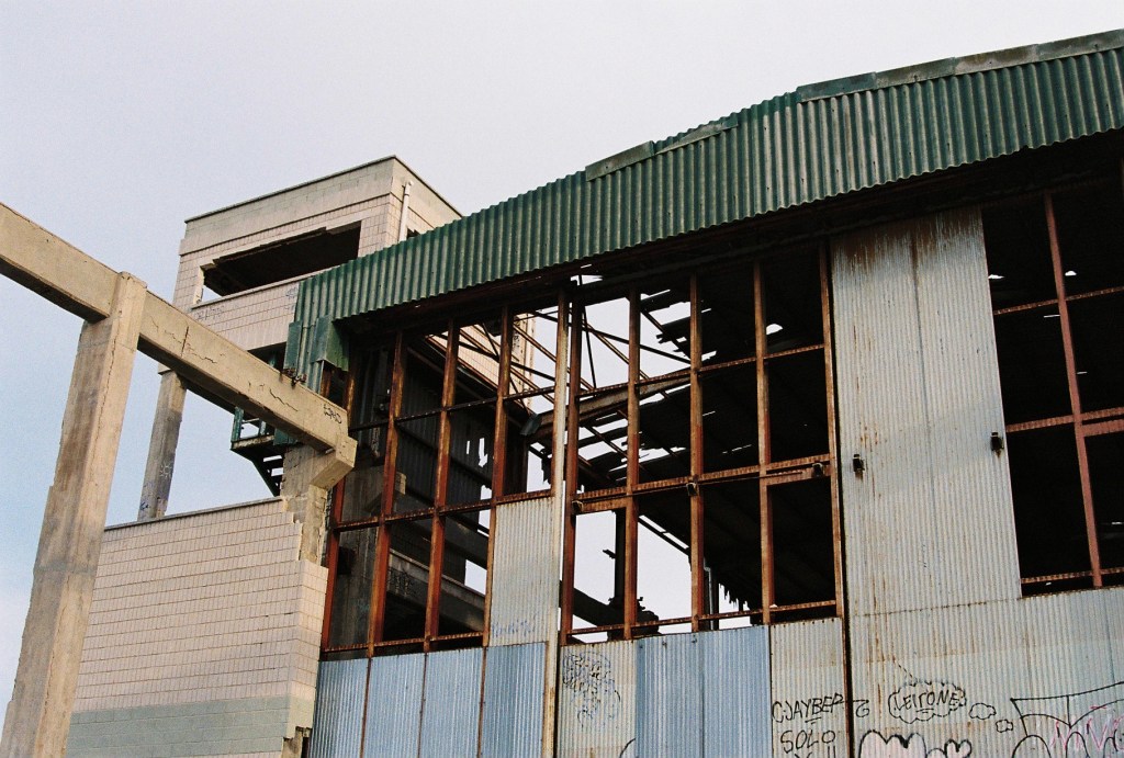 Cuando alcanzo el hormigón, levanto la vista: la entrada trasera de la nave se abre como una herida en la estructura. Entro. Dentro, el aire cambia: más frío, más espeso. El eco multiplica cada paso y los pájaros, que anidan en las vigas, se agitan inquietos, graznan. Me siento una intrusa. Es como si todo el edificio respirara y mi presencia rompiera su ritmo natural.Camino entre trozos de pared rota, tejas de amianto, chapas retorcidas y grafitis que se mezclan con las manchas del tiempo. Algunos son solo firmas, otros figuras en rojo y negro que parecen observarme desde el muro. Me detengo un instante. Lo que más me impresiona no es la ruina, ni el color, ni el abandono, sino el silencio: un silencio espeso que parece tener peso propio. Pienso en cómo, en otro tiempo, aquí habría un murmullo constante: órdenes, motores, voces, el chirrido de las herramientas. Todo eso se ha desvanecido. Lo que queda es brisa y calma, el rumor de las cañas de bambú chocando unas con otras fuera, como un eco remoto del movimiento humano que fue.
