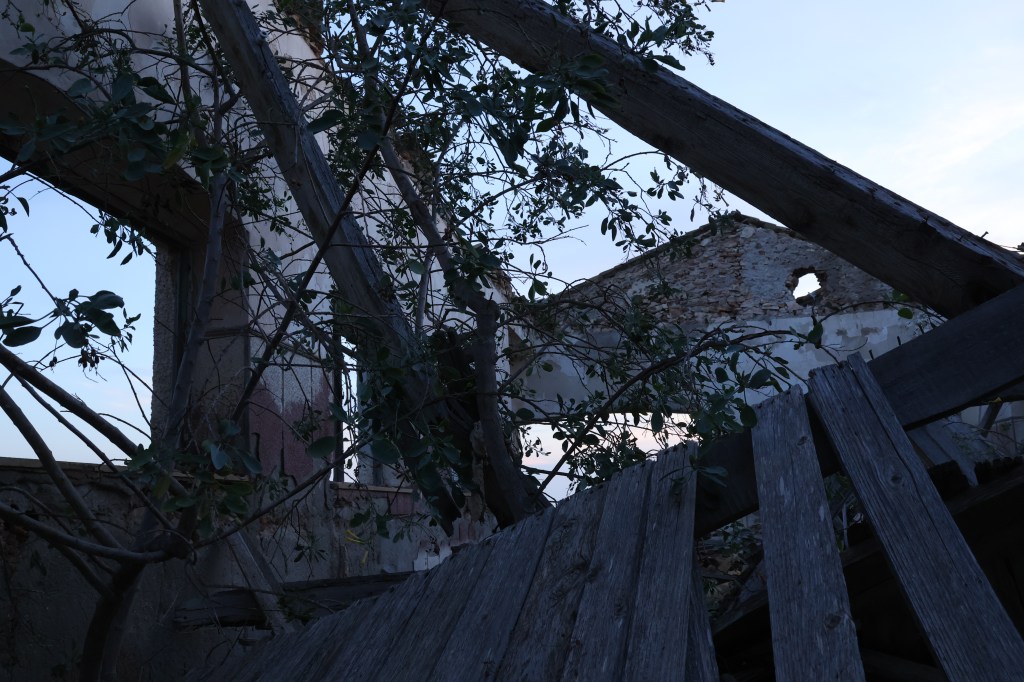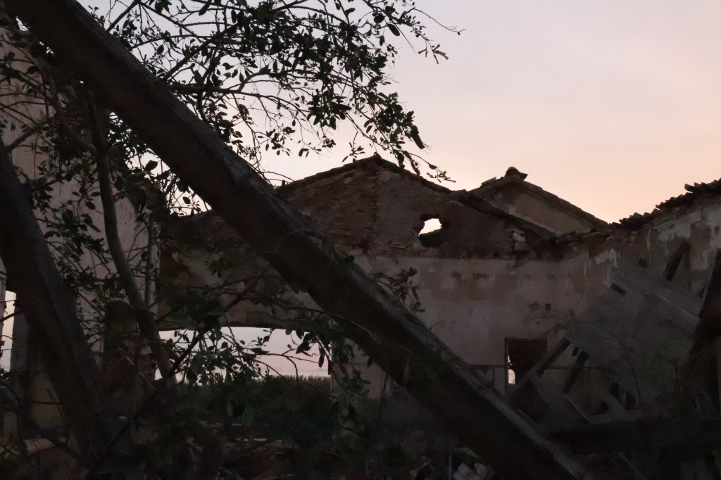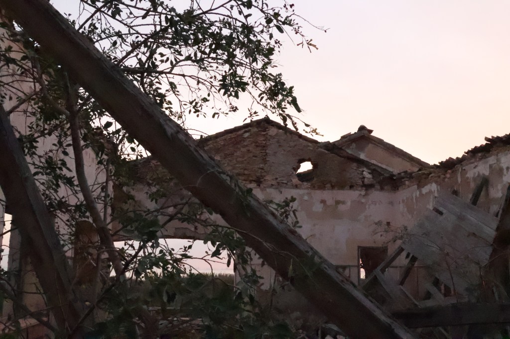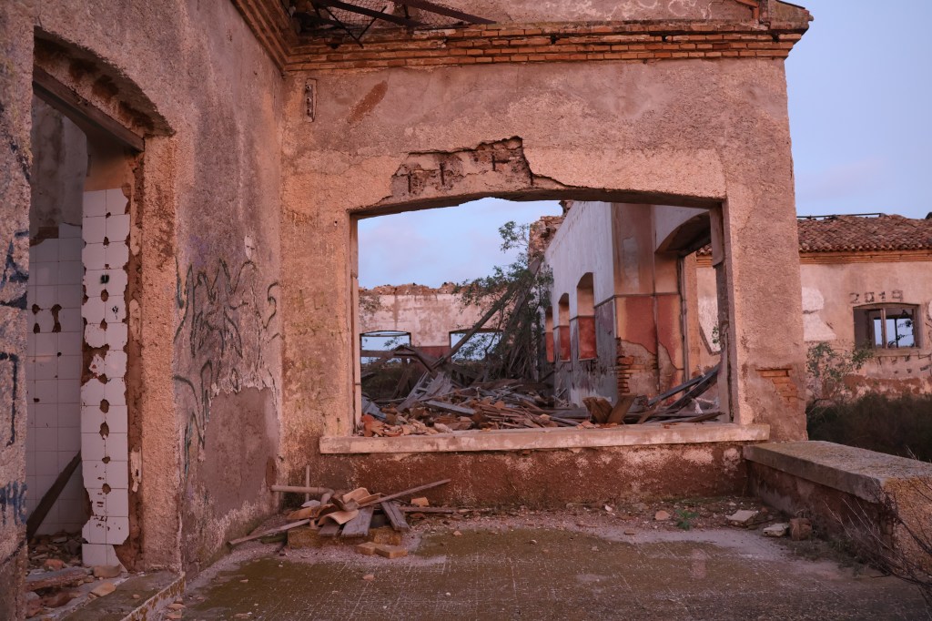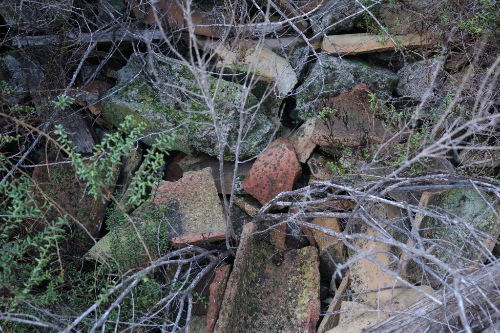A medida que avanzaba, aparecieron los restos de una construcción: un edificio de una sola planta, sin techo, derruido, con las paredes cubiertas de líquenes. El suelo estaba sembrado de fragmentos de tejas, azulejos descoloridos, botellas rotas y cristales que atrapaban la luz del amanecer. Había un silencio espeso, roto solo por el rumor del viento que se colaba entre los huecos del hormigón.