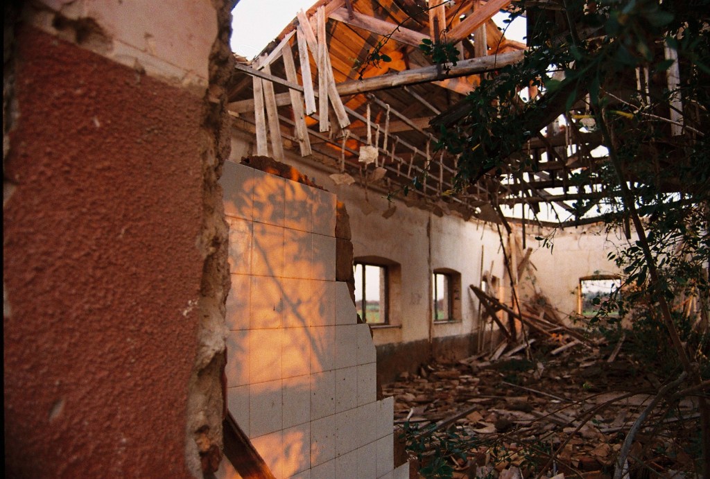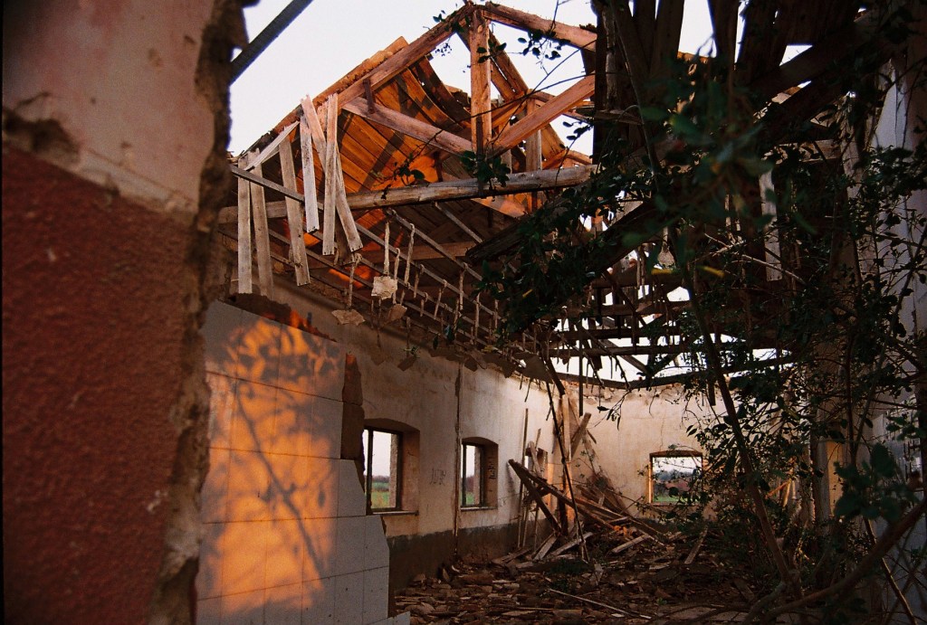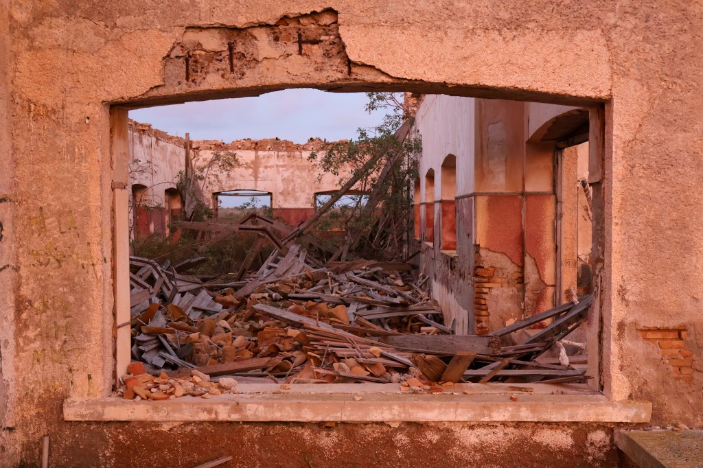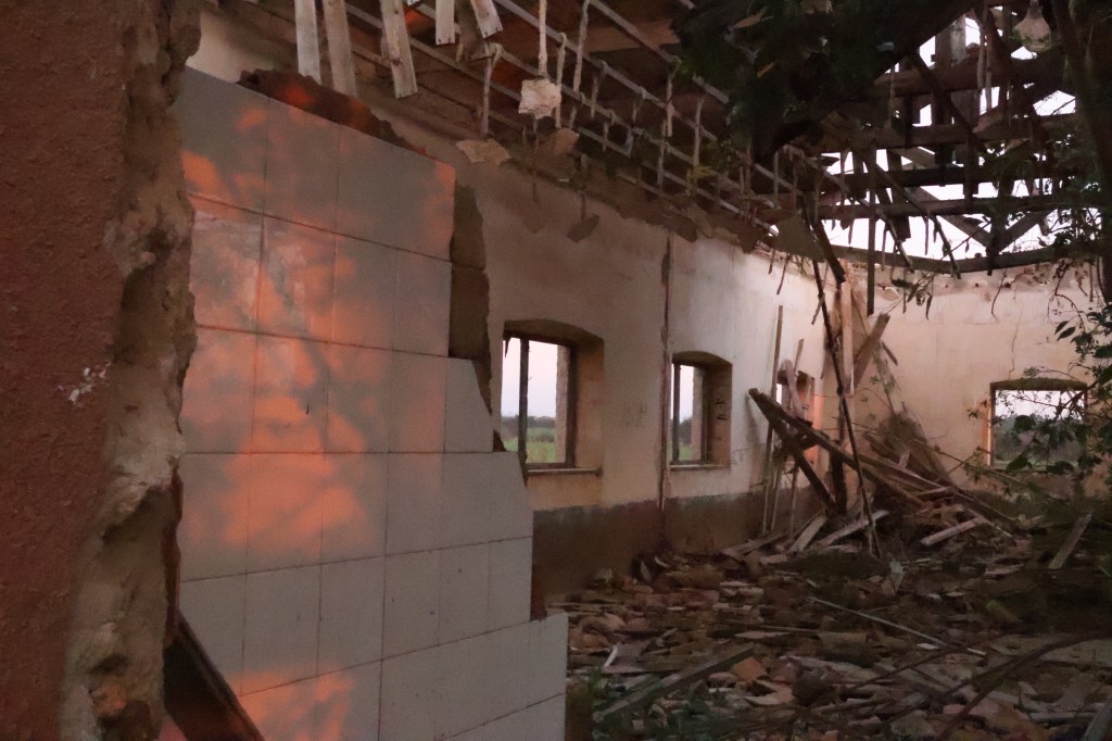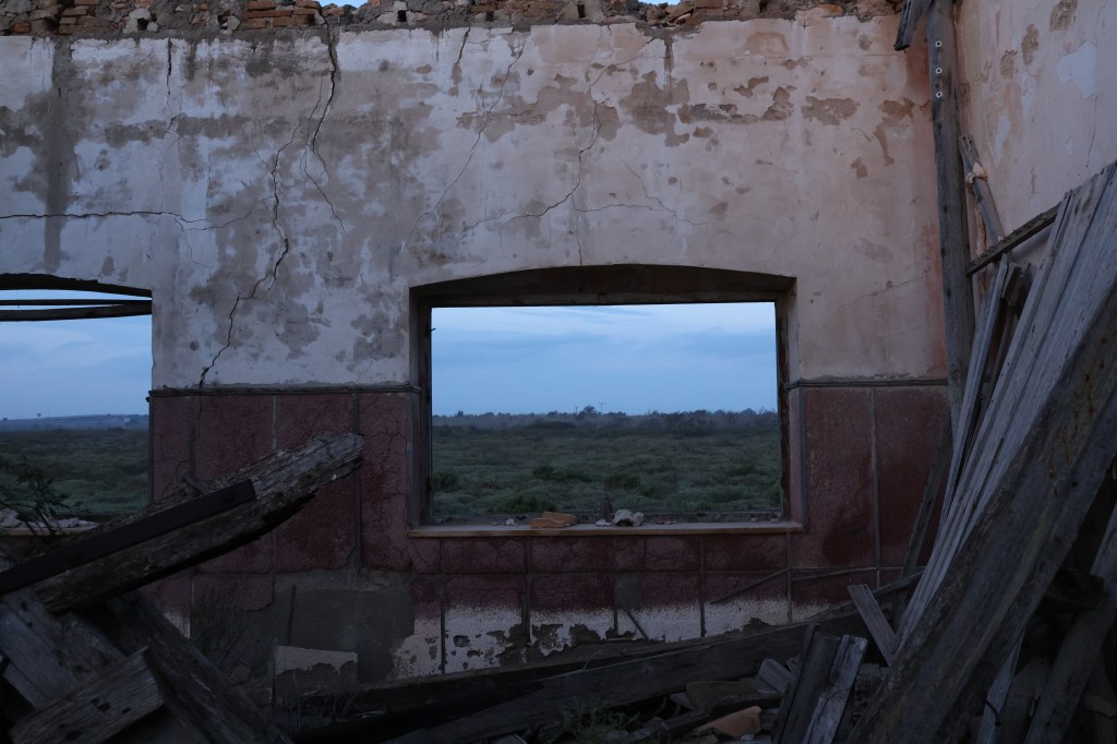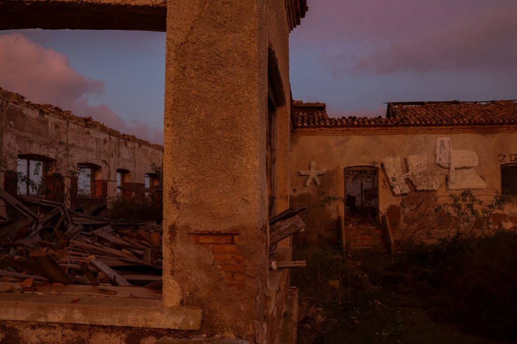 A medida que avanzaba, aparecieron los restos de una construcción: un edificio de una sola planta, sin techo, derruido, con las paredes cubiertas de líquenes. El suelo estaba sembrado de fragmentos de tejas, azulejos descoloridos, botellas rotas y cristales que atrapaban la luz del amanecer. Había un silencio espeso, roto solo por el rumor del viento que se colaba entre los huecos del hormigón.