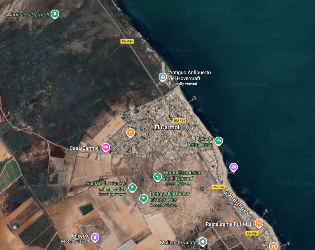 Día uno: 10 de octubre de 2025. Hace unas semanas compré un billete para bajar a mi casa. Hoy estoy de camino al tren. En la estación, mientras espero, abro el portátil y comienzo a buscar mapas antiguos del Campo de Cartagena. Tecleo: “El Carmolí. Zona militar abandonada”. Aparecen archivos dispersos: planos borrosos, fotografías aéreas, coordenadas imprecisas. Los descargo como quien recoge fragmentos de una historia que se resiste a ser completa.