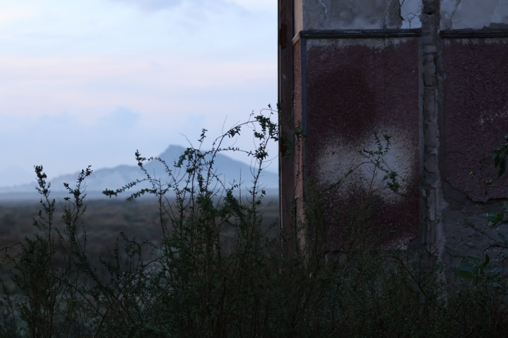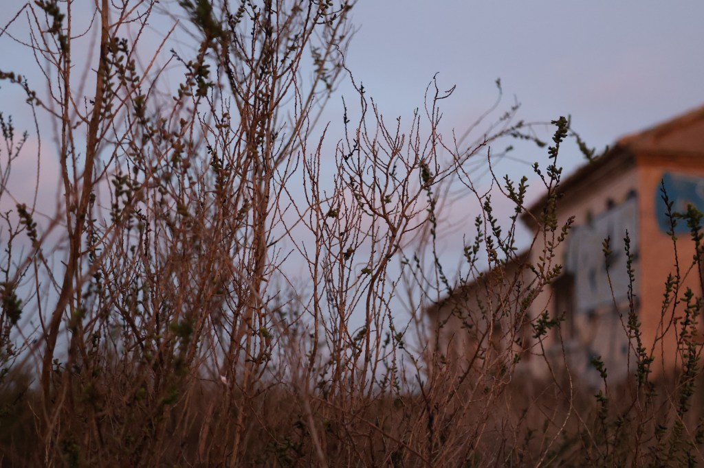 Me acerco. El sol cae detrás del monte y el cielo se convierte en un mosaico de naranjas y violetas. El búnker tres —o quizás el cuatro, no importa— se impone como una interrupción del terreno. Su superficie blanca está manchada por sombras que avanzan lentamente, como si el día lo cubriera de su propio polvo. A su alrededor, la tierra parece más viva, más roja, más insistente.