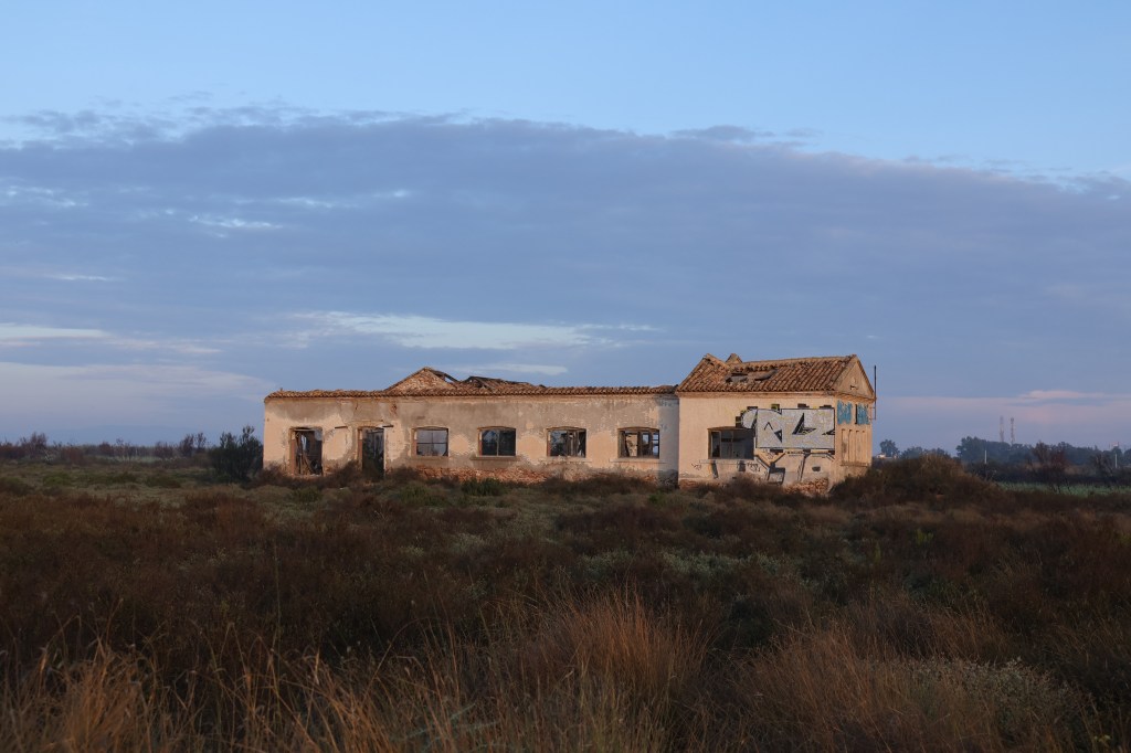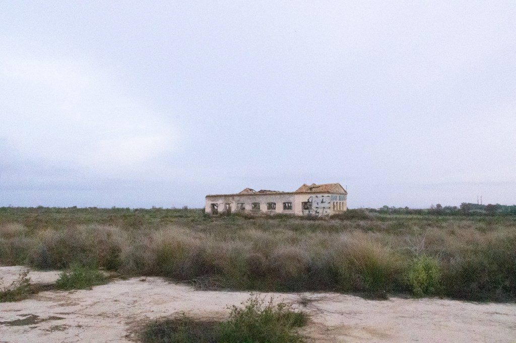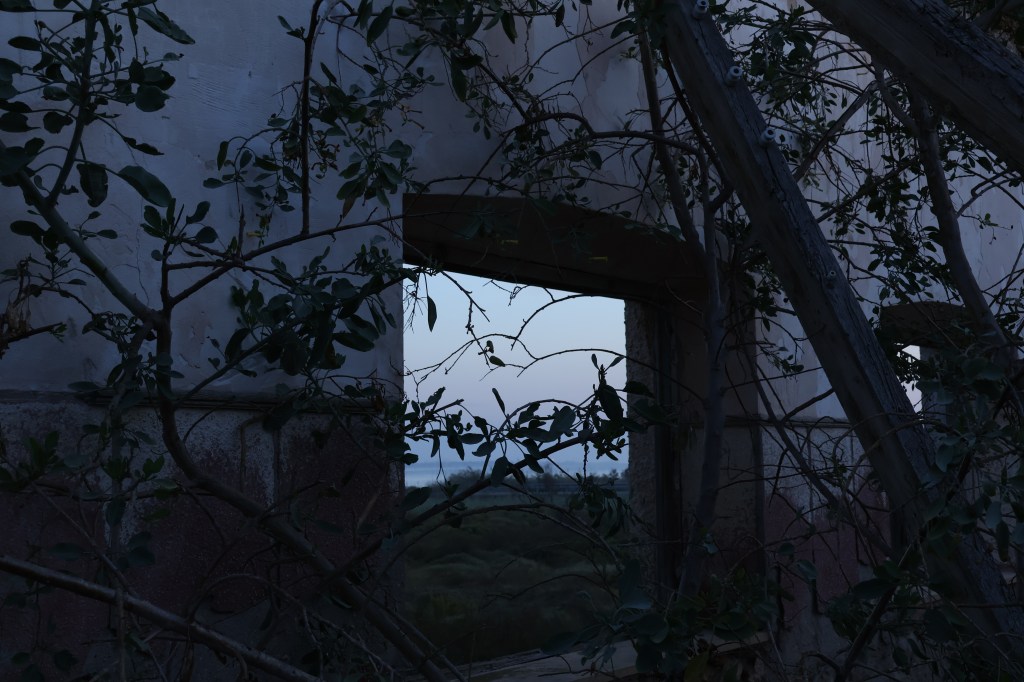 A las seis de la tarde conduzco por la carretera RM-F54. El sol cae bajo y alarga las sombras sobre el asfalto. A mi derecha, los humedales reflejan un cielo translúcido, casi metálico; a mi izquierda, una muralla espesa de cañas de bambú se agita con el viento, tan densa que apenas deja ver el Mar Menor. El aire huele a sal y a tierra húmeda, a ese perfume espeso que ha dejado la DANA tras tres días de lluvia incesante.Sigo el camino hasta distinguir, a lo lejos, la silueta de la nave abandonada: el antiguo anfipuerto del hovercraft. Se alza solitaria, un bloque de metal y silencio que domina el paisaje. Me detengo frente a sus puertas: dos planchas altas de chapa oxidada que, bajo la luz del atardecer, parecen haber mutado de gris a un verde azulado. Es curioso cómo el óxido cambia el color del metal, cómo lo que una vez fue rigidez y pulido se vuelve textura, mancha, vida mineral. Estanqueidad, pienso. Todo aquí parece sellado, detenido, conteniendo una historia que no se deja filtrar.Recuerdo haber entrado por detrás cuando tenía quince años, desde la playa. Entonces el edificio era una aventura. Hoy es una ruina que impone respeto, un testigo mudo del tiempo que pasa sin mirar atrás.Aparco cerca de una escuela de canoas, donde el paso sigue inundado. Camino sobre ramas y matorrales que sobresalen del agua; algunas se hunden, otras me sostienen por segundos. Las botas se manchan de barro y el aire huele a caña rota.