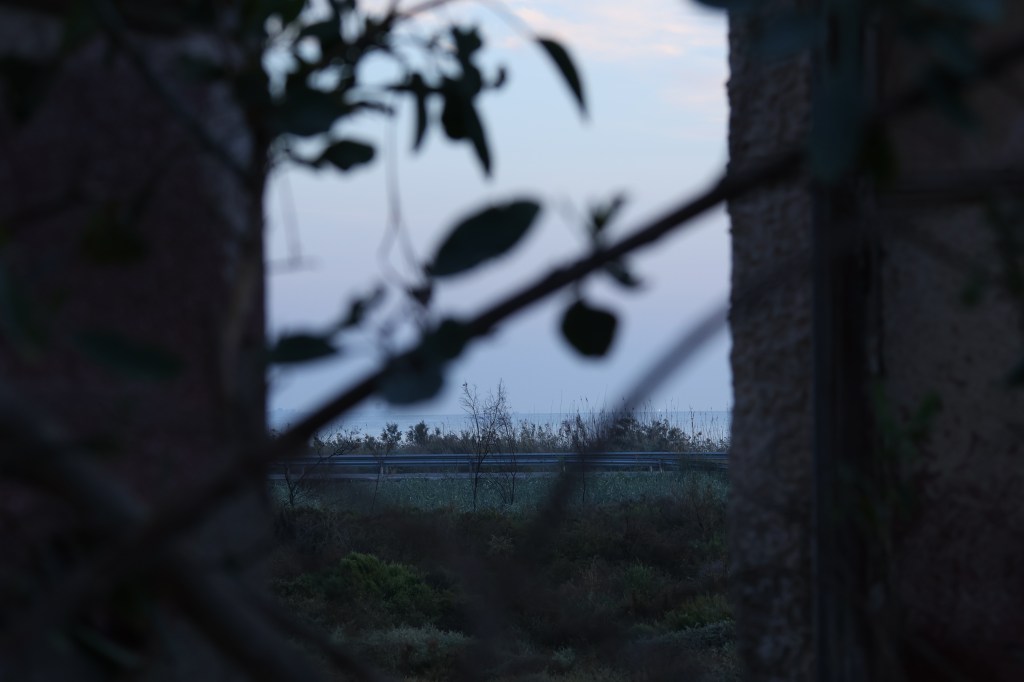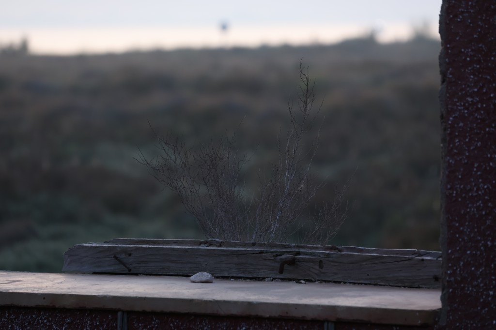 El viento sopla con constancia. La luz baja. El paisaje empieza a perder su volumen, volviéndose plano, casi fotográfico. Camino en torno al búnker y siento que el color de la tarde se deposita sobre el hormigón como una capa de polvo luminoso. Me detengo y miro hacia el mar.